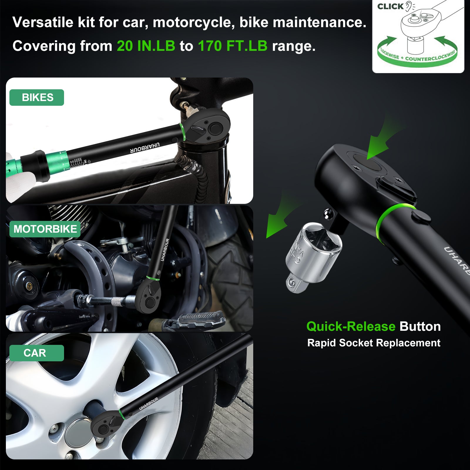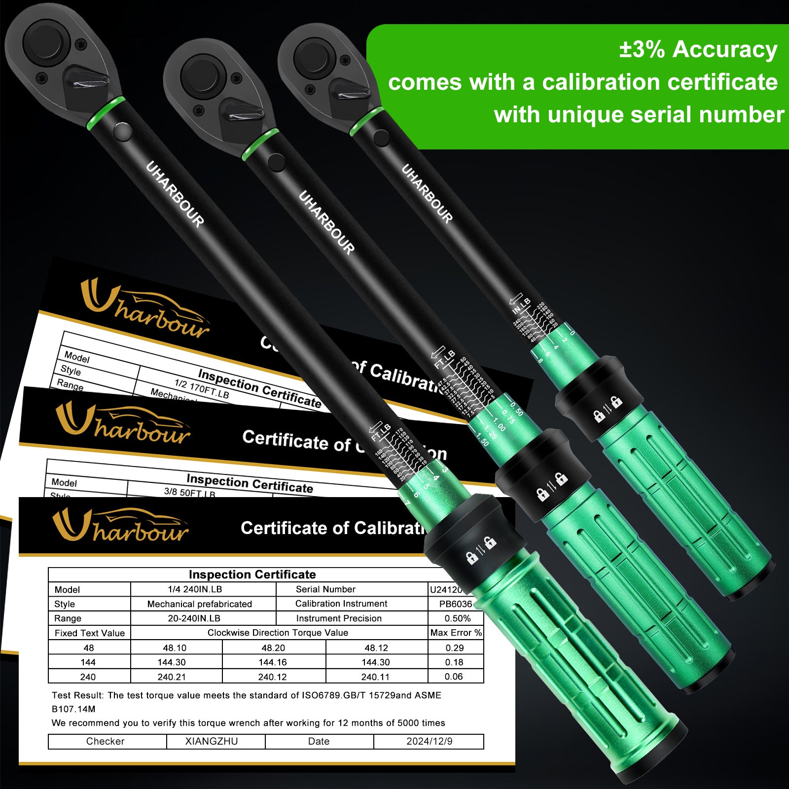 Uharbour Torque Wrench Set 1/4 3/8 1/2, 3Pcs Torque Wrench Set 20-240in.lb 5-50ft.lb 10-170ft.lb, Dual-Direction 72 Tooth Click with 1/4 3/8 1/2 Adapters for Car, Motorcycle, Bicycle